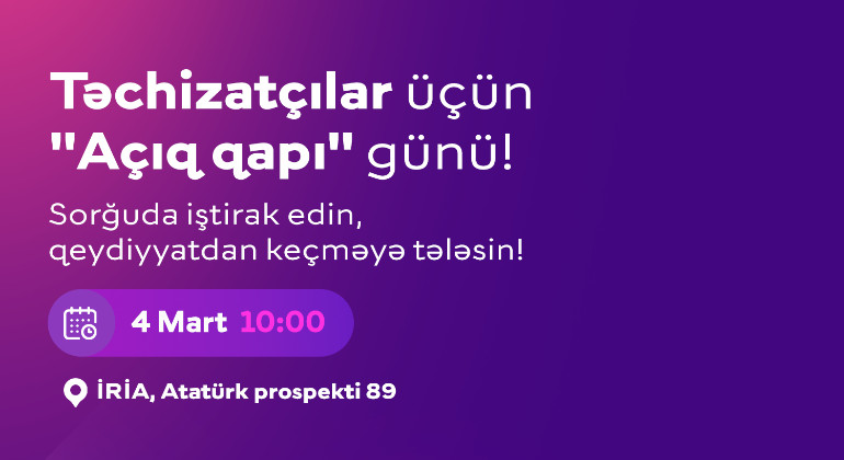 İRİA satınalan təşkilat olaraq qanunvericiliyə əsasən maliyyə vəsaitindən səmərəli və qənaətlə istifadə edilməsi, satınalmaların şəffaflıq, aşkarlıq, ədalətlilik, rəqabətlilik və bərabərlik əsasında həyata keçirilməsi məqsədilə potensial təchizatçıları “Açıq Qapı”görüşünə dəvət edir.